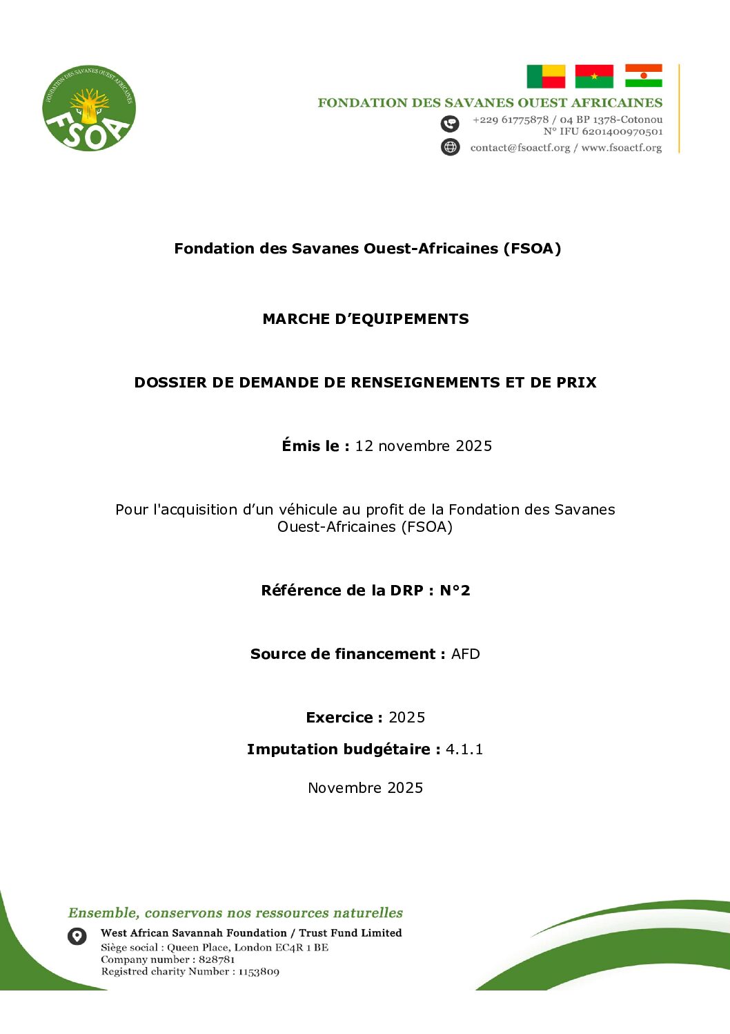 DOSSIER DE DEMANDE DE RENSEIGNEMENTS ET DE PRIX POUR L’ACQUISITION ET L’INSTALLATION D’UN GROUPE ELECTROGENE AU PROFIT DE LA FONDATION DES SAVANES OUEST-AFRICAINES (FSOA)3 octobre 2025